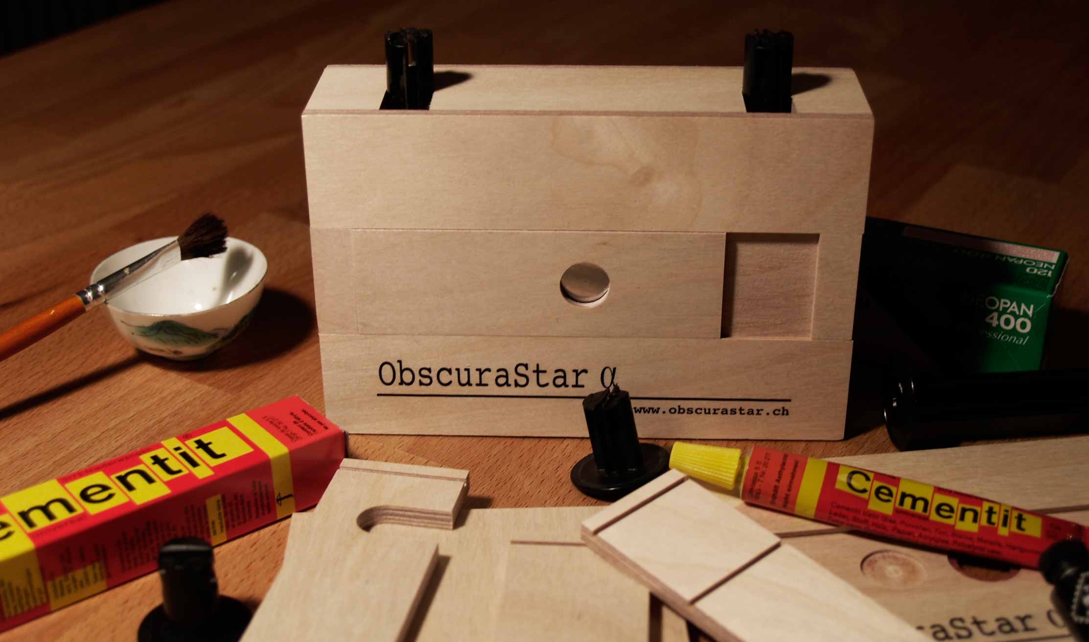 Spezifikationen des Bausatzes: Material: Flugzeugsperrholz - Masse: 134 (L) 87 (H) 39 (B) Gewicht: 180g (ohne Film) Bildweite: 30mm - Lochgrösse: 0.2mm - Blende 157 - Filmformat: 120 Rollfilm. Der Bausatz wird mit einer bebilderten Gebrauchsanleitung, einer Tube Cementit (Leim), einer Tube schwarzer Farbe und einem s/w 120er Negativ-Rollfilm geliefert.